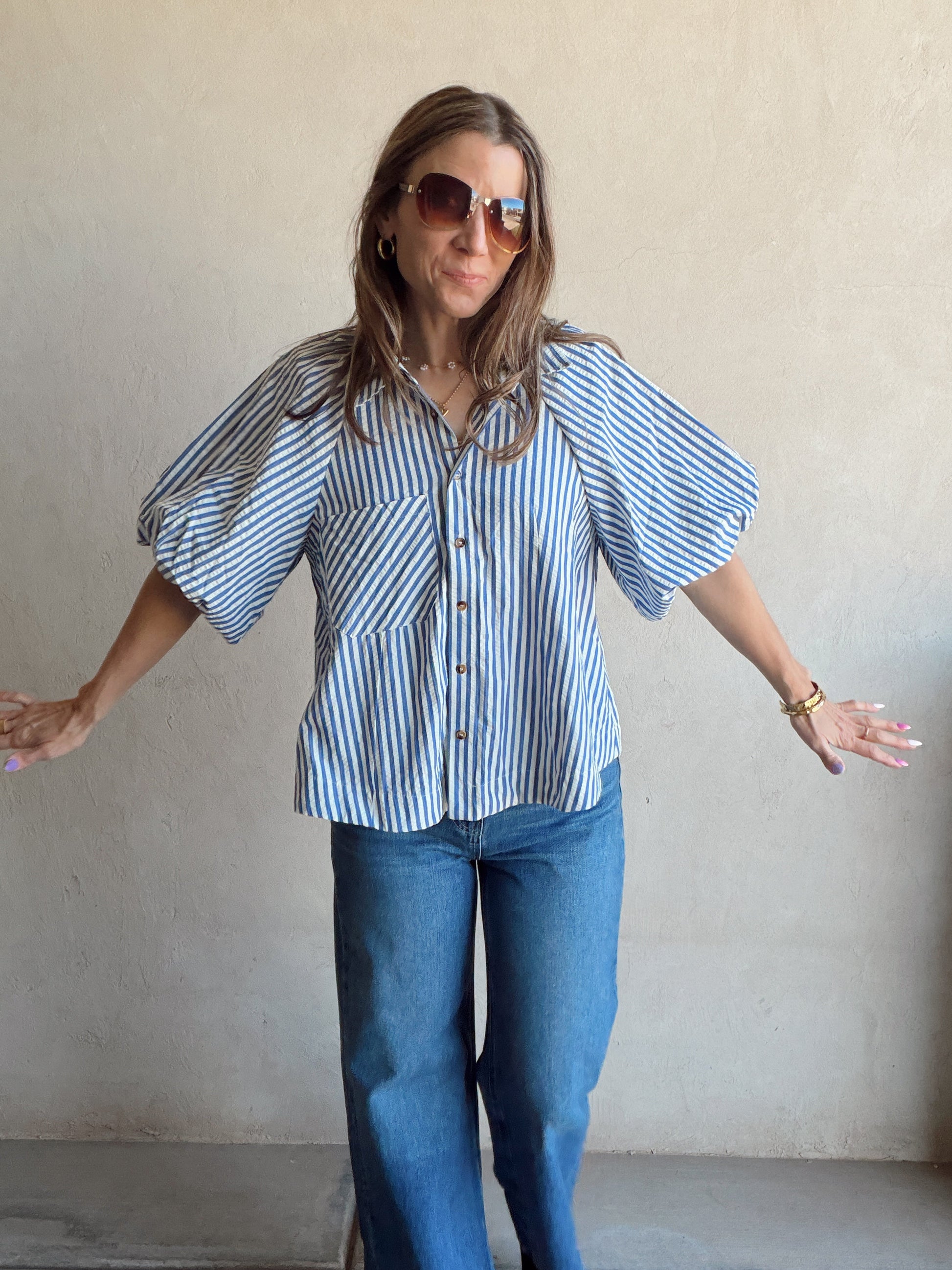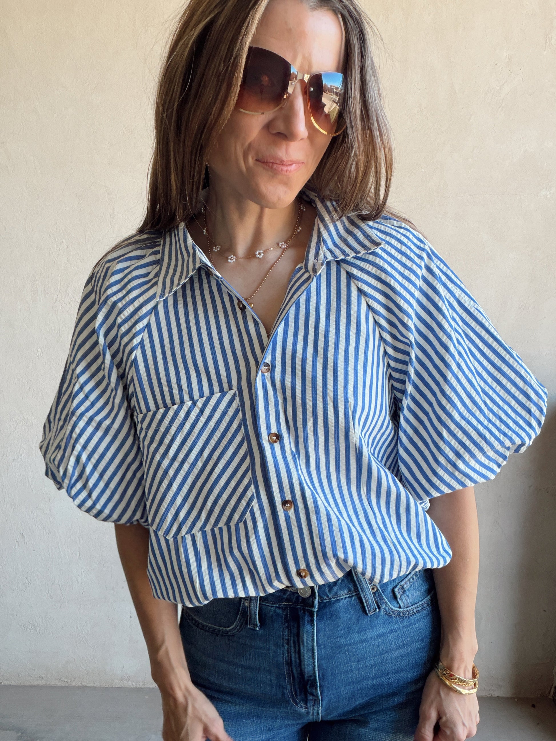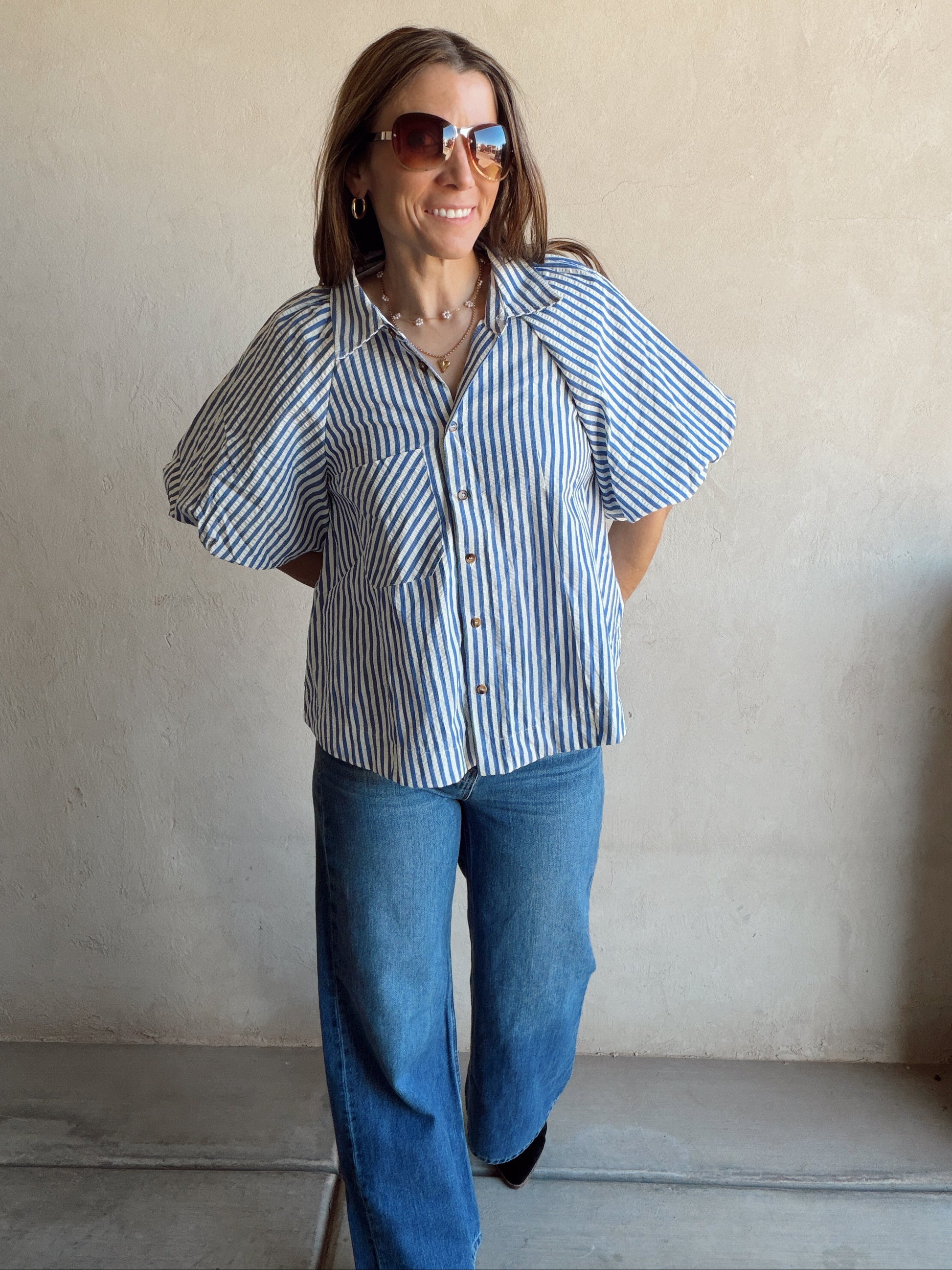 Jess Button Up Top in Blue Stripe