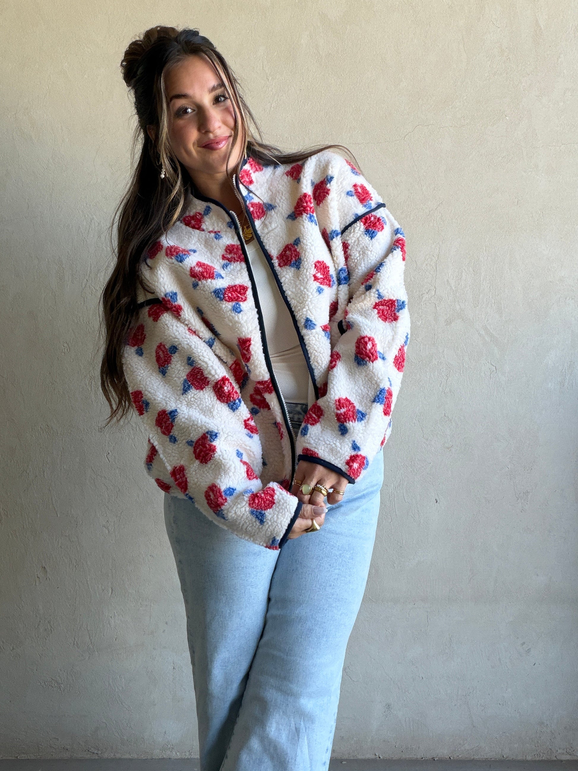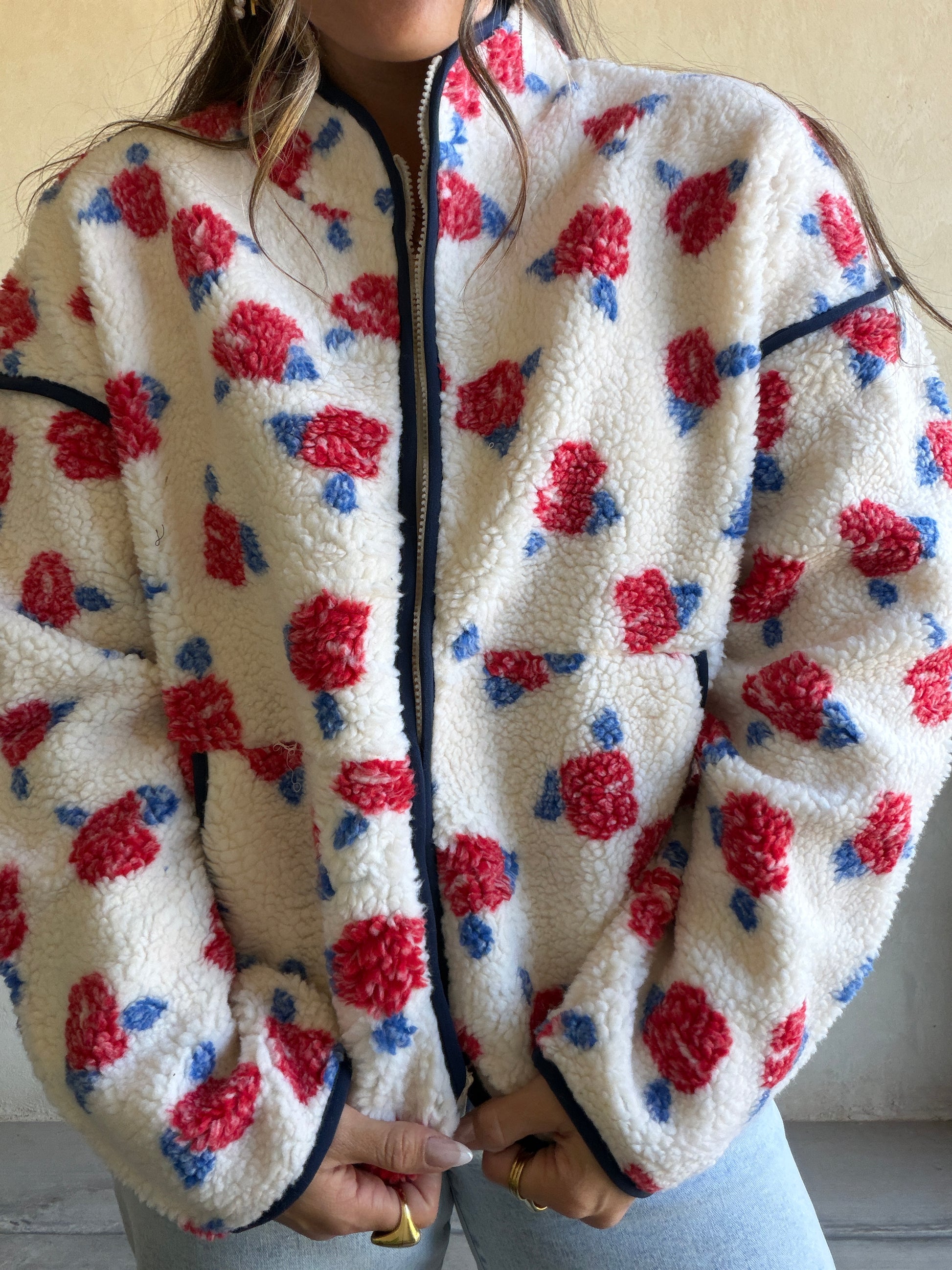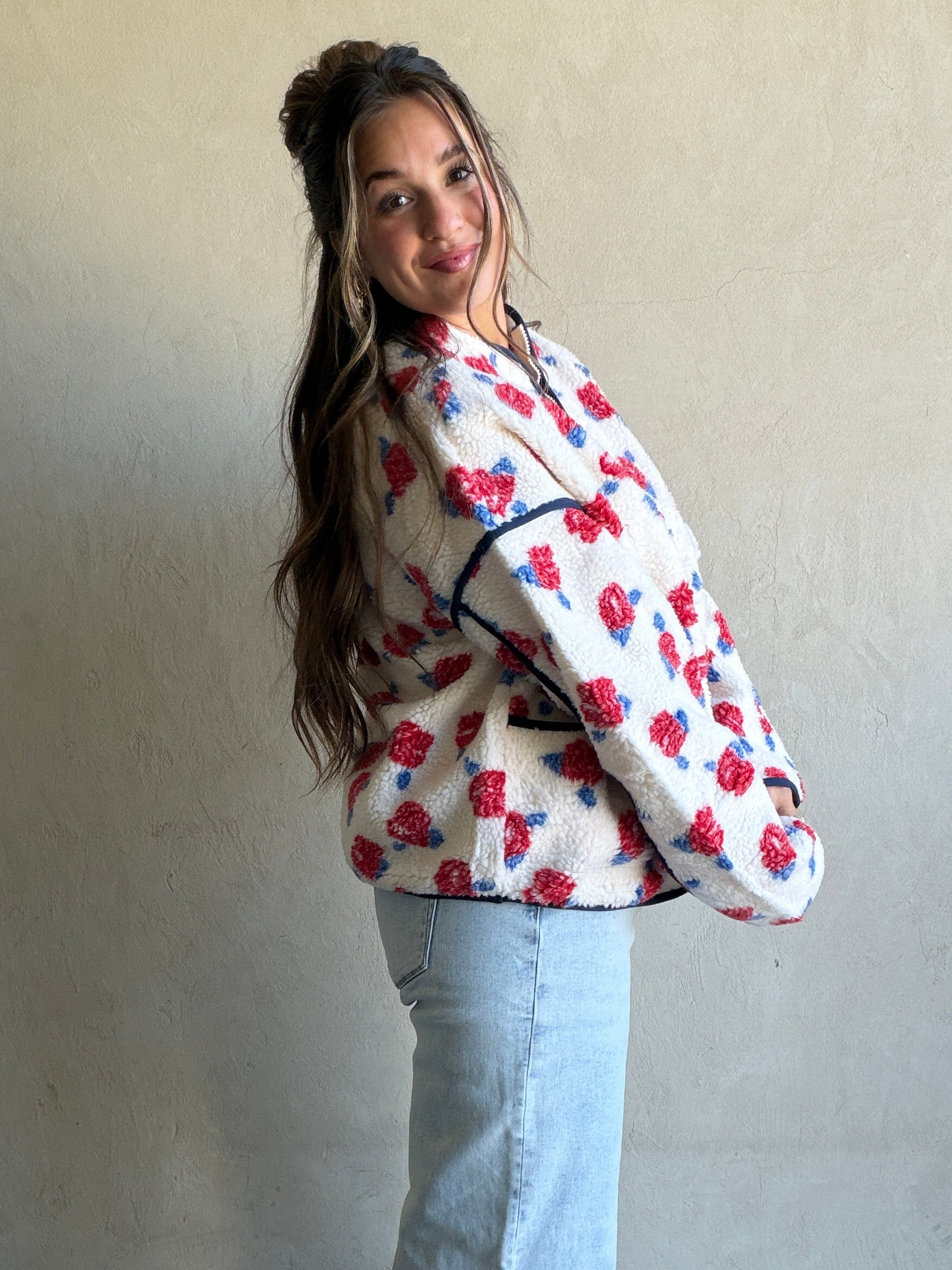 Luann Sherpa Jacket in Cream, Navy, & Red