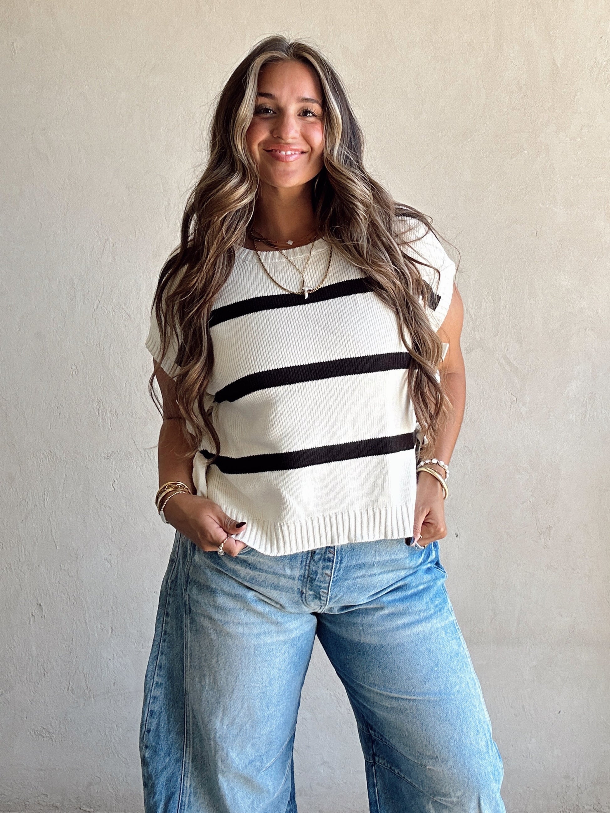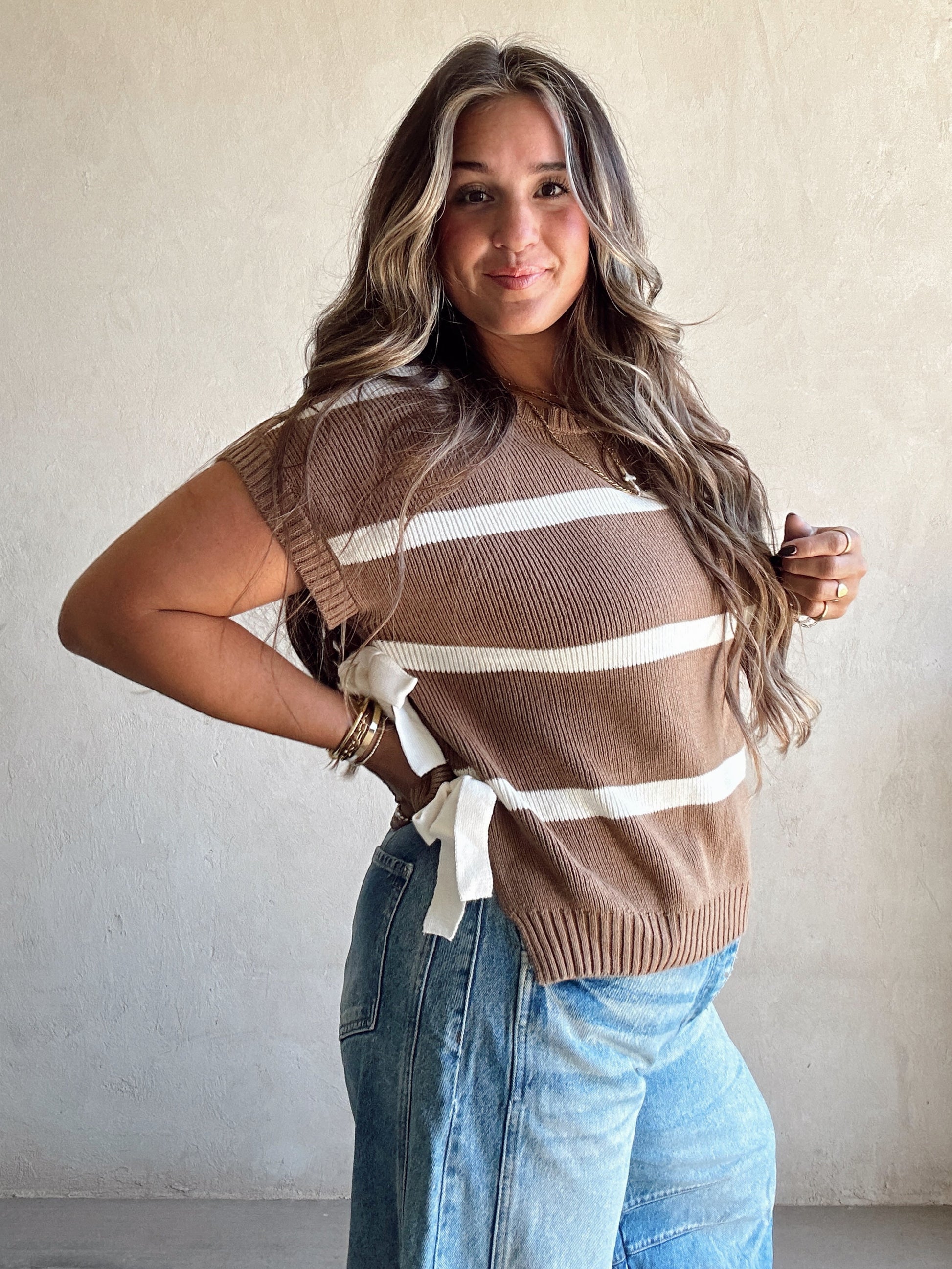Lainee Striped Top with Side Bows in Navy, Mocha, and Ivory